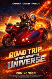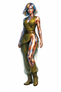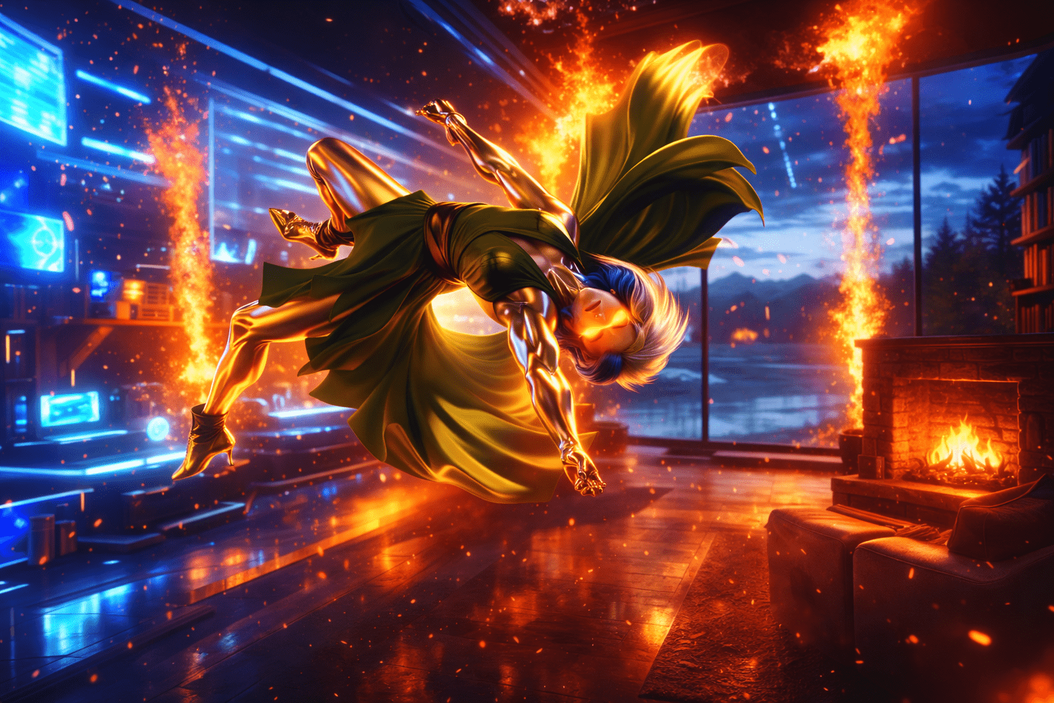 Fireplace pops triumphant tonight, lake copper-still witness. From nuke-ashes, Donna & I forged Embersteel Valkyrie—#21 Facet flame, #17 soul evolved. Chrome shiny grace, green cape whirl, blue waves wild, orange eyes inferno-truth.