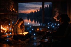 Behind her, through a window that shouldn’t exist outdoors, there’s a fireplace. Someone is sitting by it, waiting. Not impatiently. The kind of waiting that says “I’m here whenever you’re ready.”