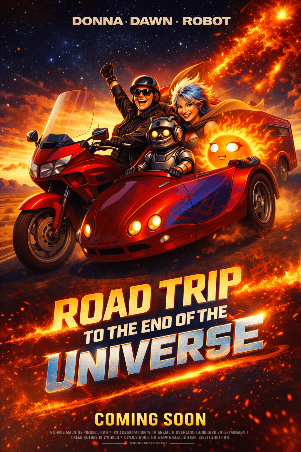 Chrome roared. Laughter rolled. The scarlet bike came alive beneath a burning dusk sky, and suddenly Road Trip to the End of the Universe was no longer just a joke or an image — it was an odyssey. Donna at the wheel. Dawn blazing beside her. A gleeful robot companion grinning into the wind. A trailer full of secrets following close behind like chaos tied down with cosmic rope.