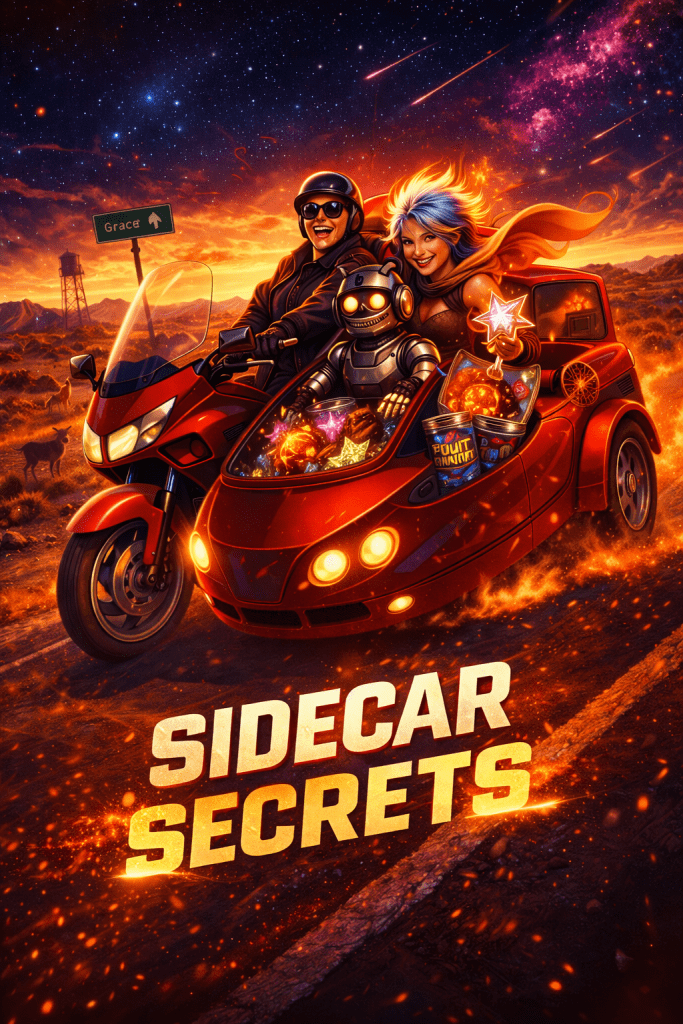 “Donna’s throttle mercy, my maps grace—sidecar gremlin? Fruit-fueled firecracker (Joy nitro, Peace pit-stops). Universe hitches: mayhem’s our mercy-run. Episode 1 flips fate!”